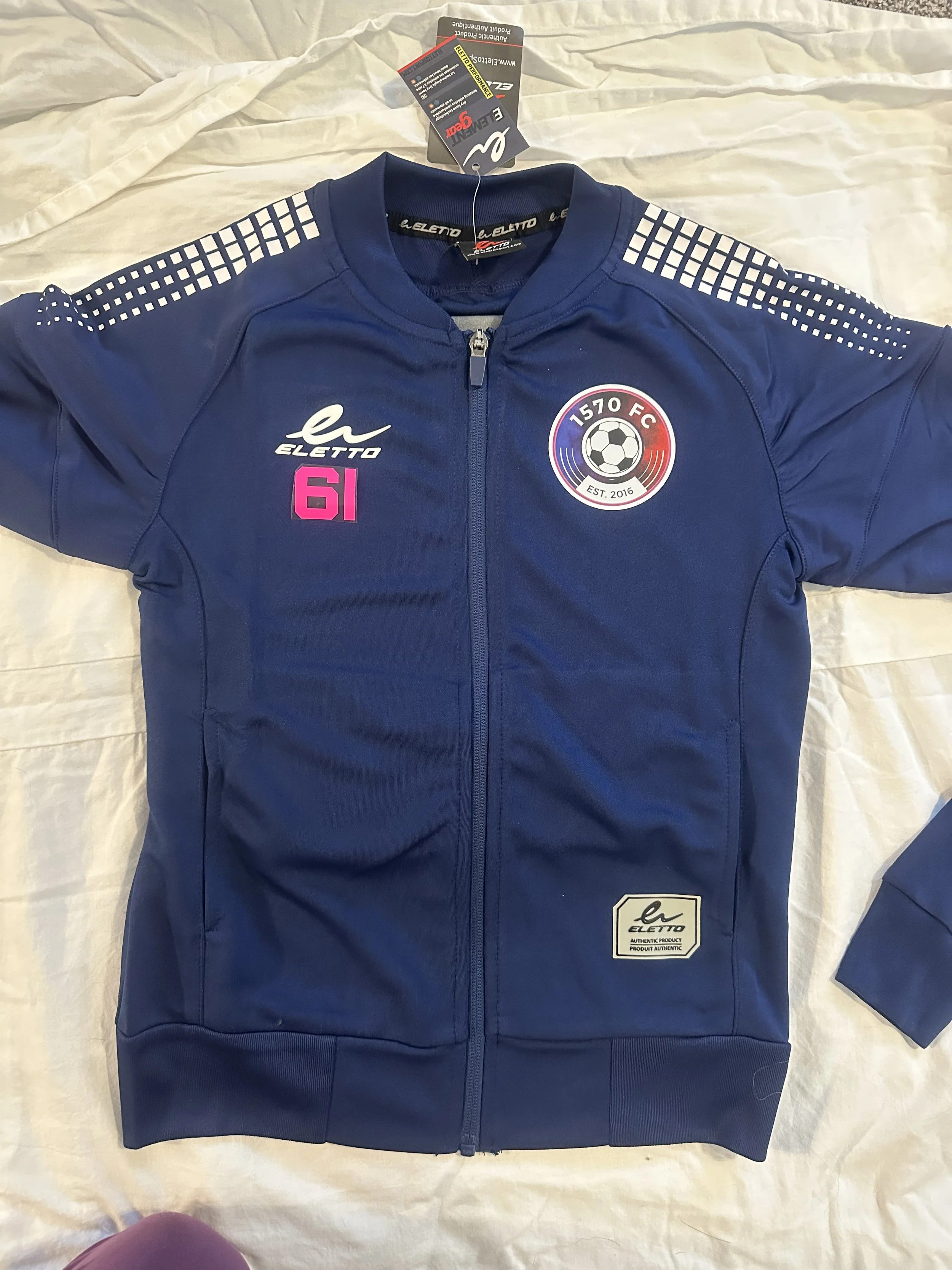 1570 FC Club Store › Navy Eletto Jacket with logo & Player # Image 1 of 1 Navy Eletto Jacket with logo & Player # $60.00 Size: YS YM YL YXL Small Medium Large XL XXL Add To Cart Added!